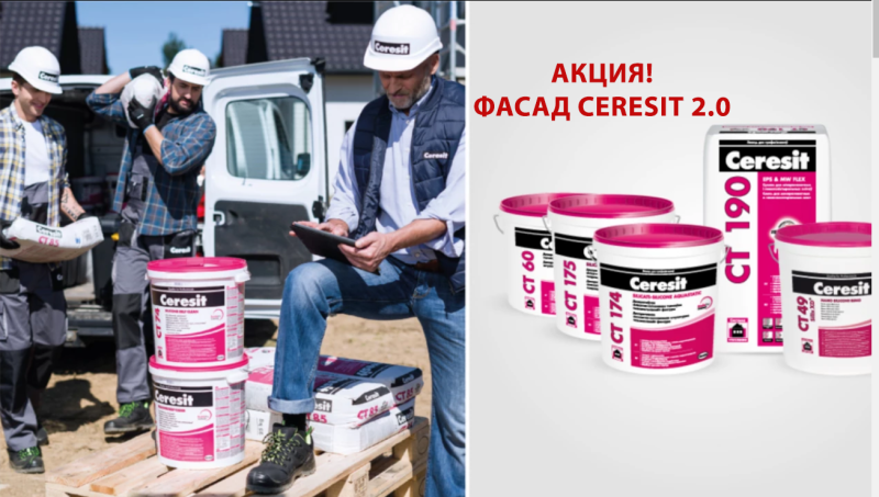 В акции принимают участие следующие материалы: Готовые к применению штукатурки Ceresit CT 60, СТ 174, СТ 175; Фасадная краска CT 49; Клей для теплоизоляции СТ 190.